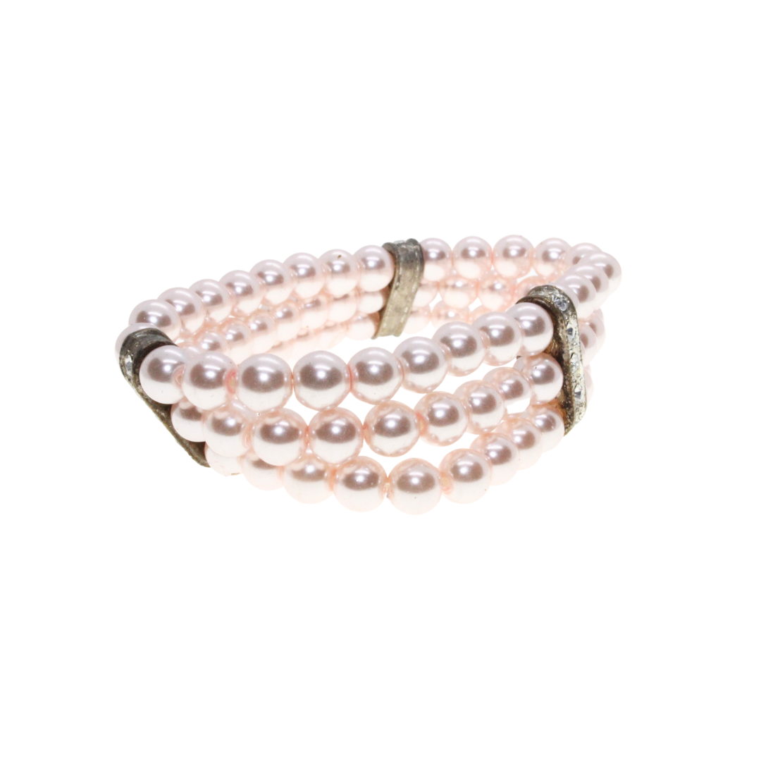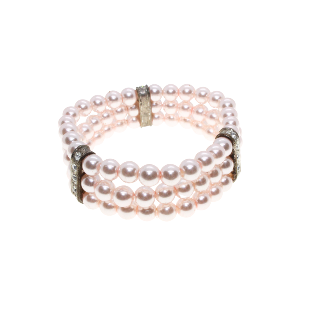 Bracelet – Silver Tone 3 Layered Pink Faux Pearls with 3 Diamante Strips. Stretchable. – ML2995