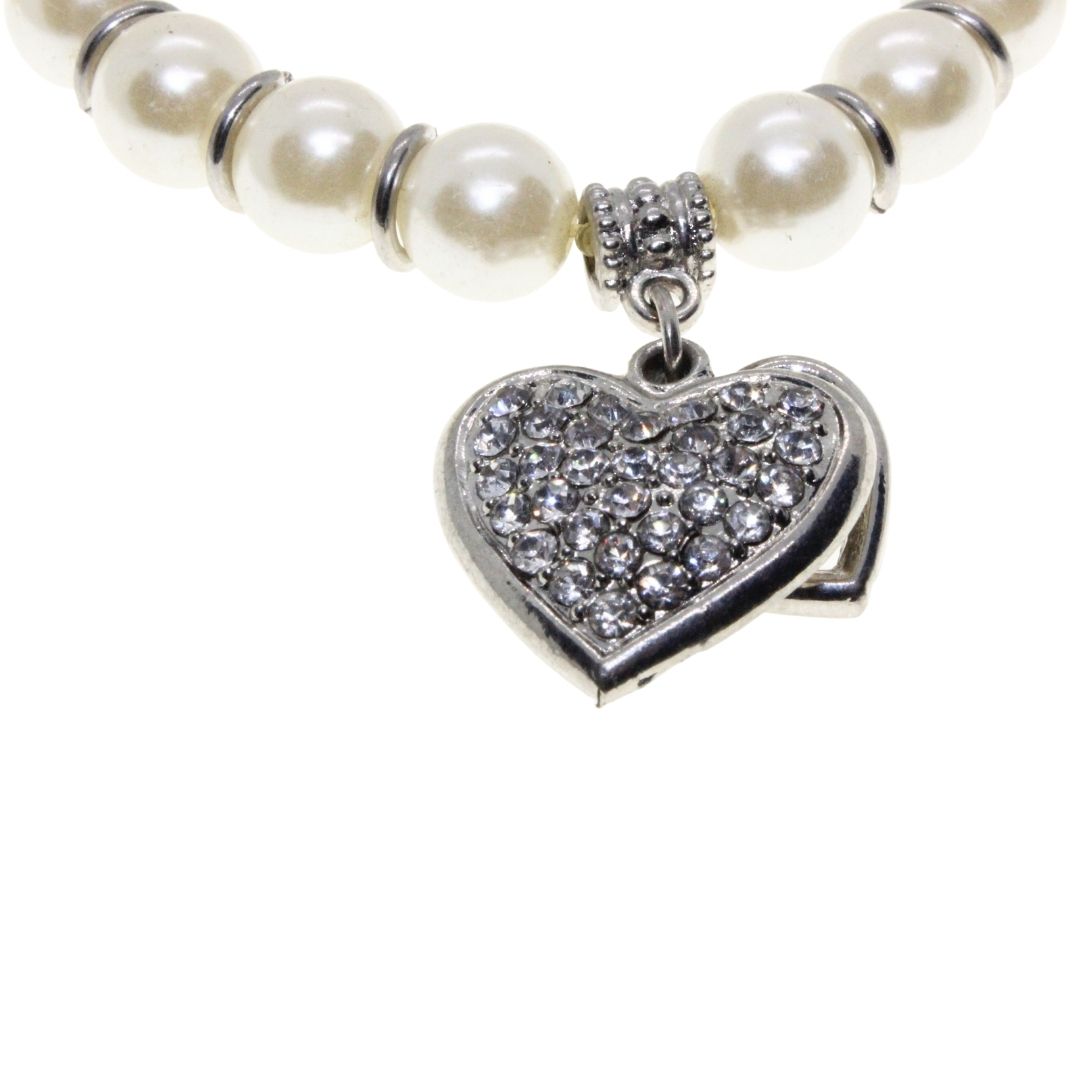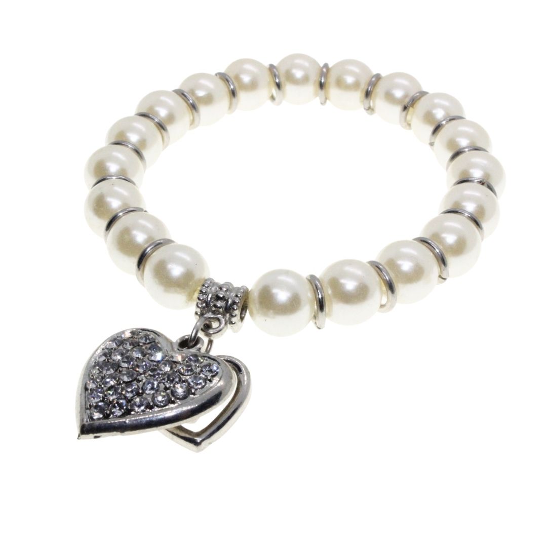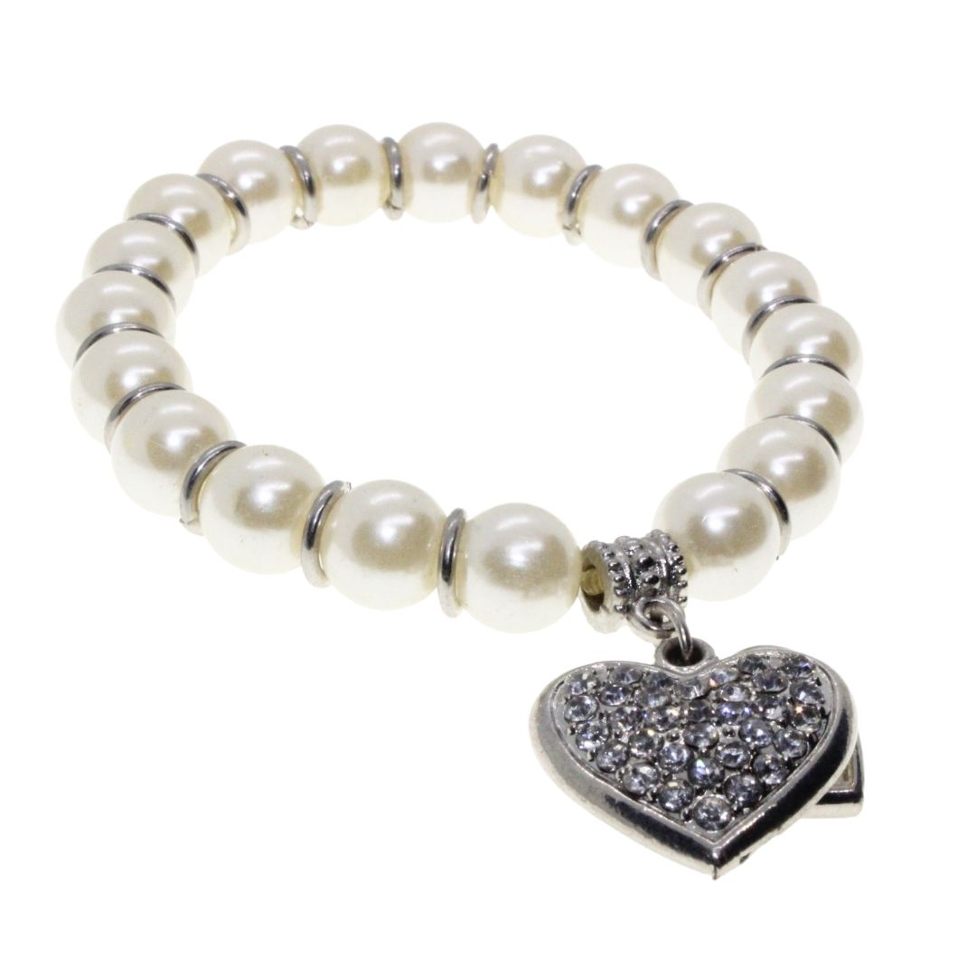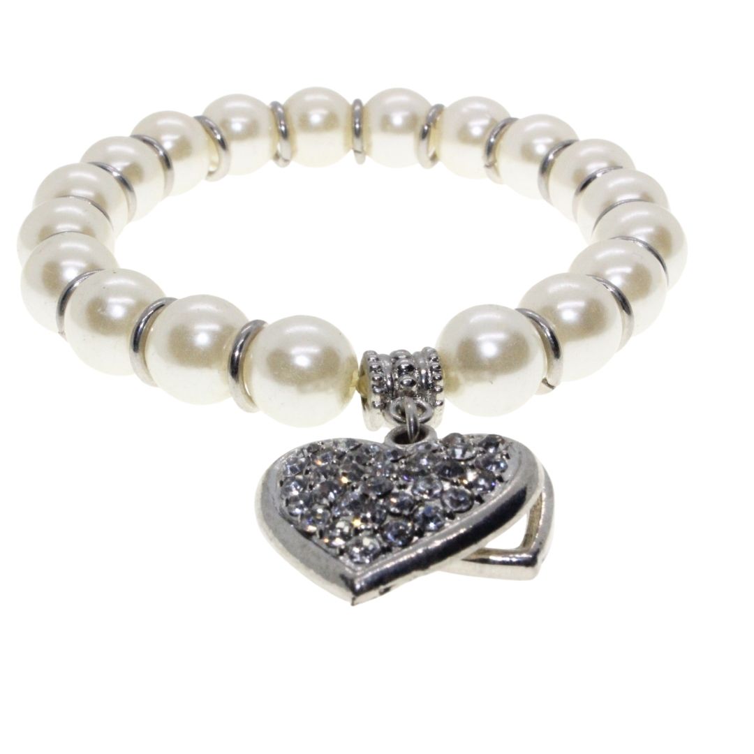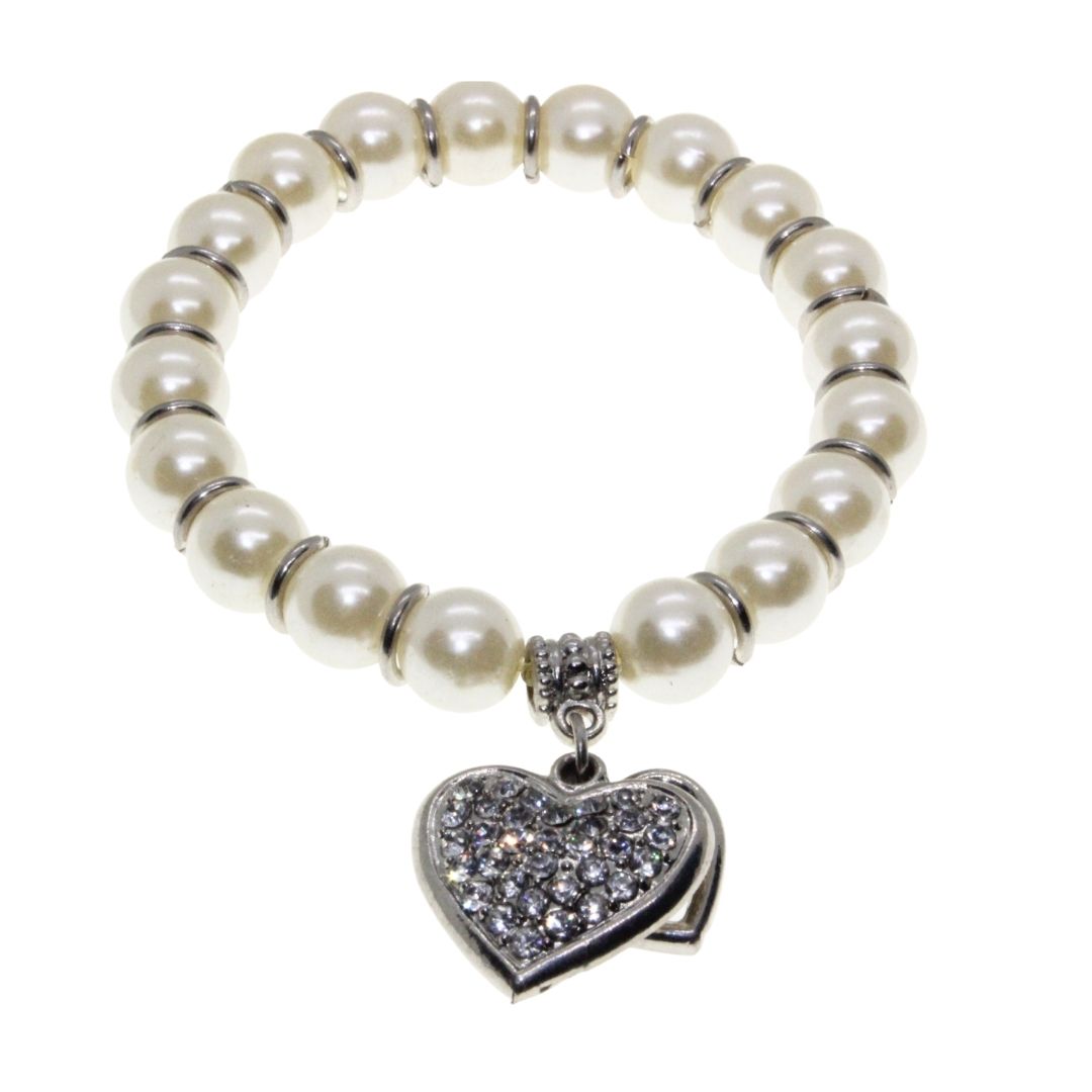 Bracelet – Silver Tone Faux Pearl Bracelet. Silver Tone Heart Pendant covered in Diamantes – ML3142