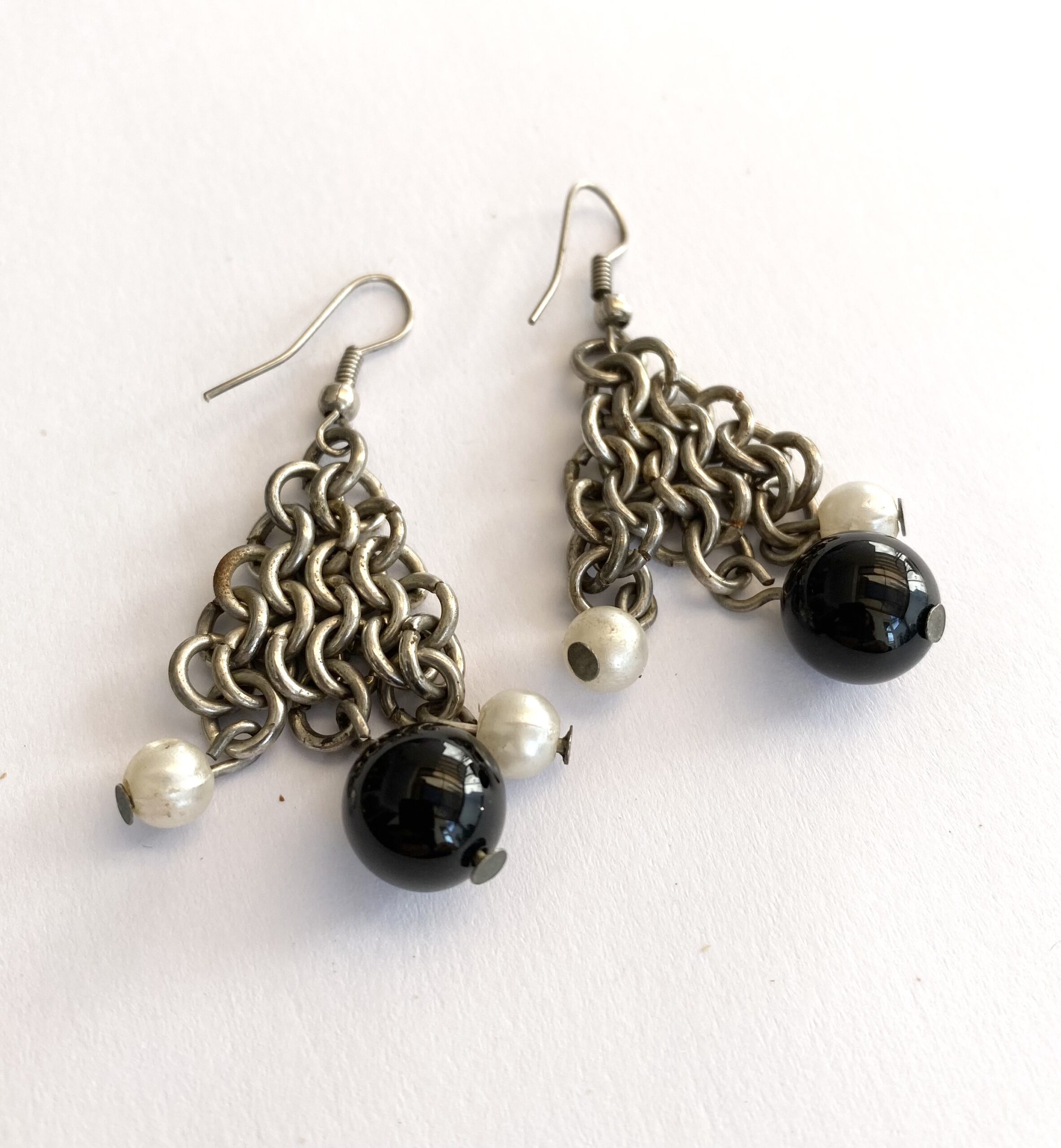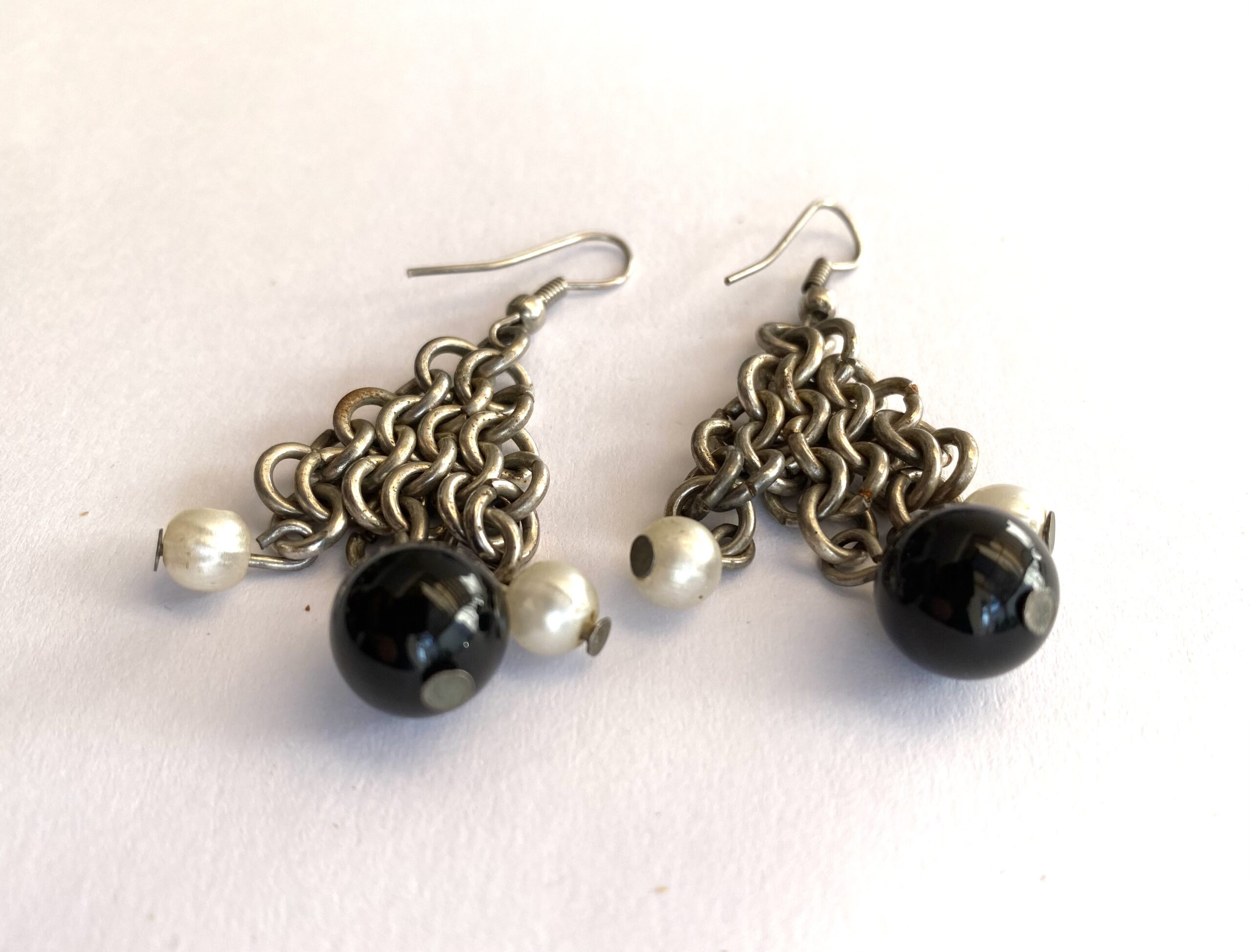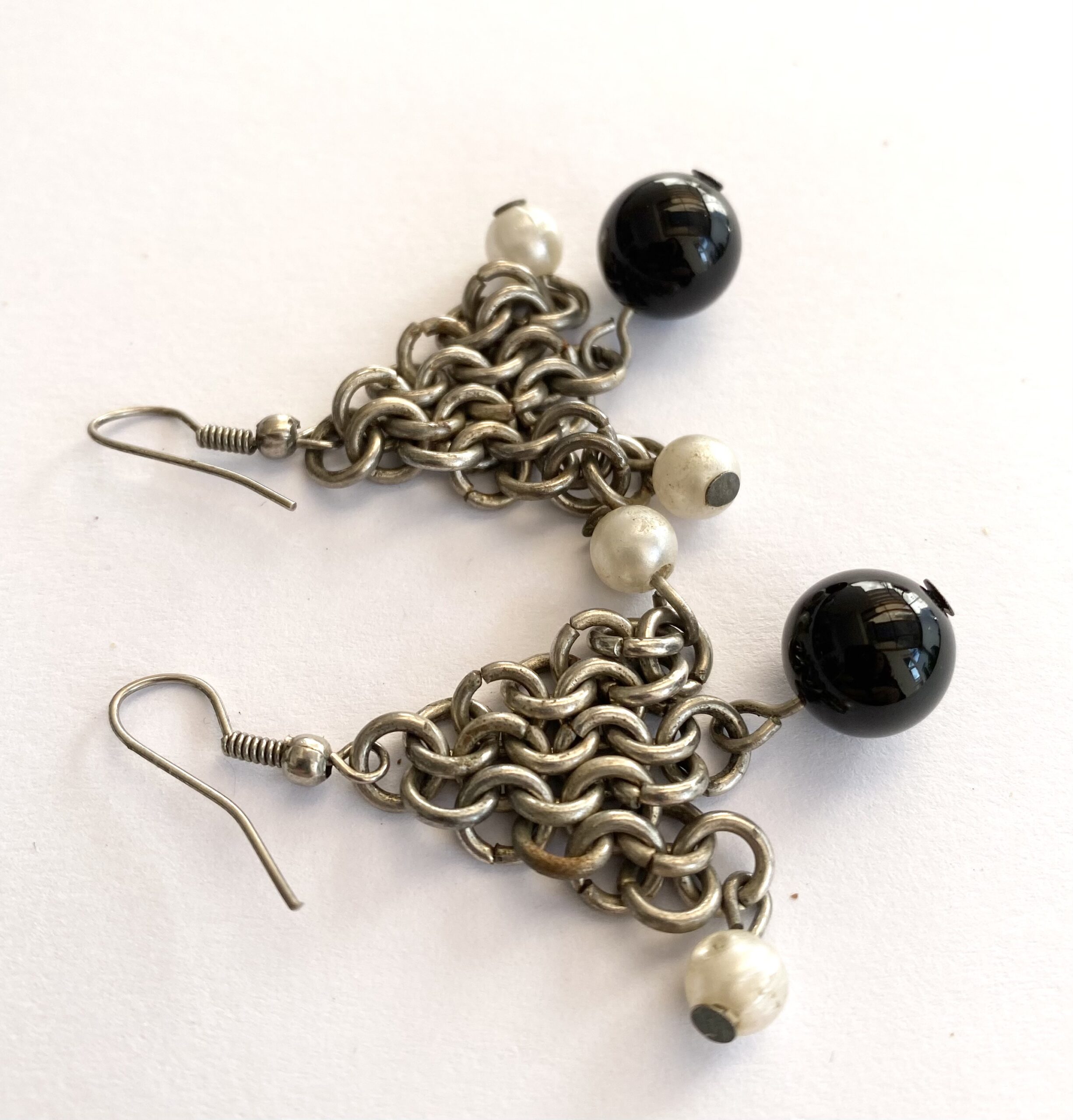 Earrings – Drops With Hanging Chains With Beads on End. Silver Colour