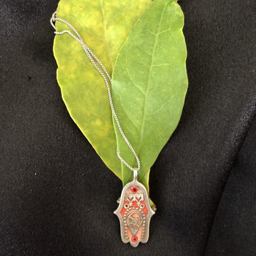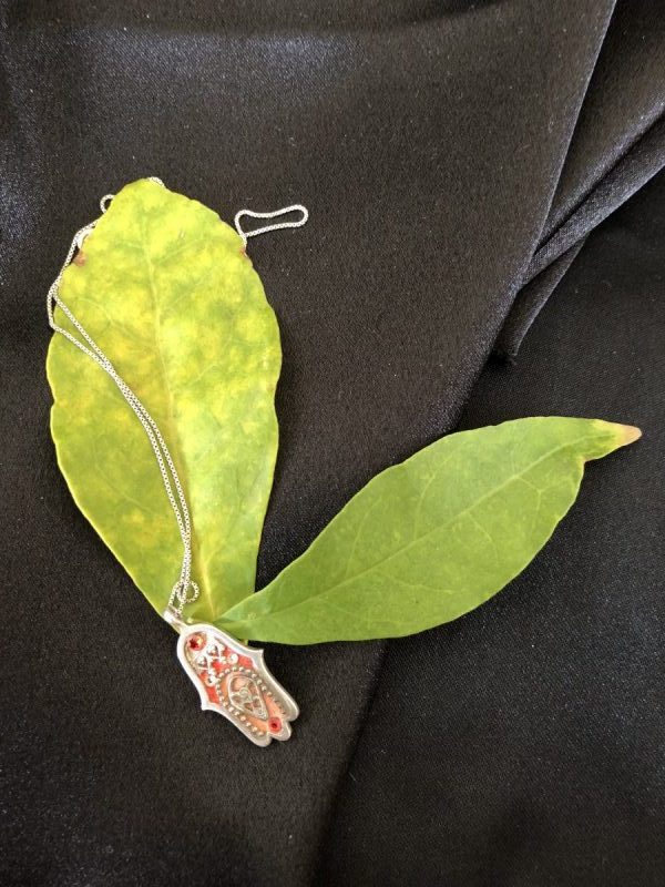 Necklace – .925 Silver Hamsa on Chain with Small Red & White Stones Red colour on Front Dimensions: Chain 210mm Condition: Good