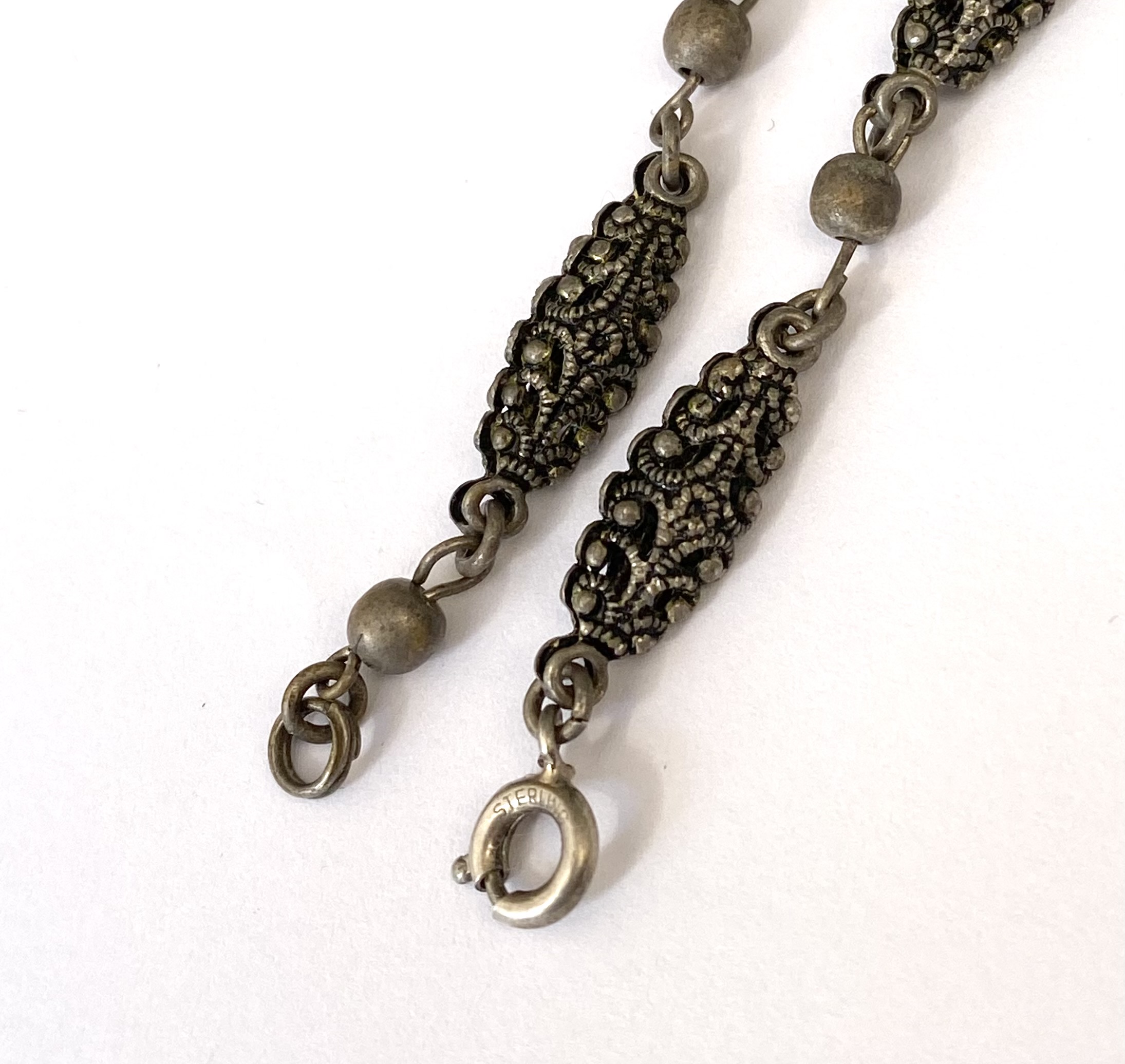 Necklace – Vintage Sterling Silver Rustic Chic Chain With Blue Stones. 3 x half moon central pendants #ML1602