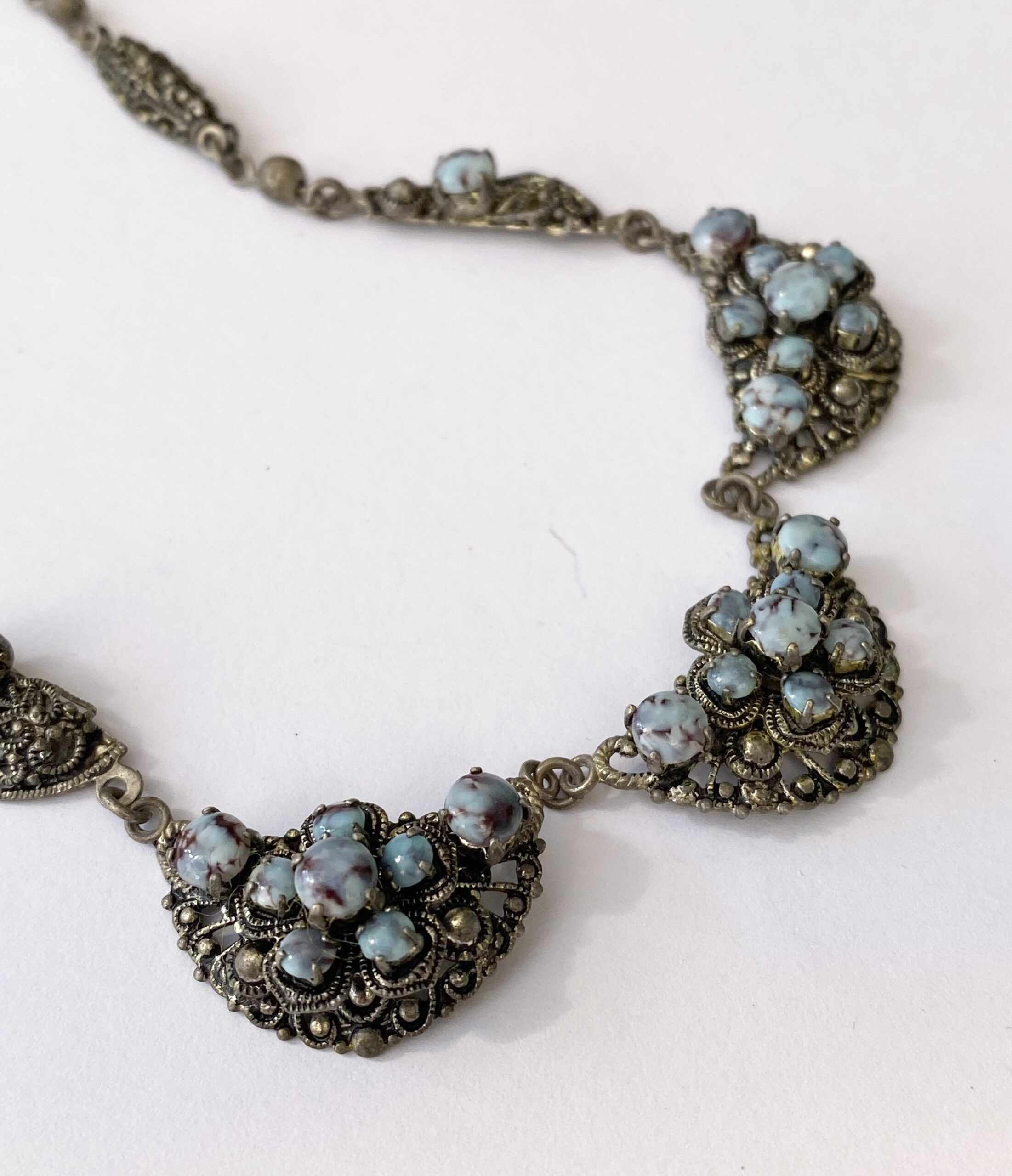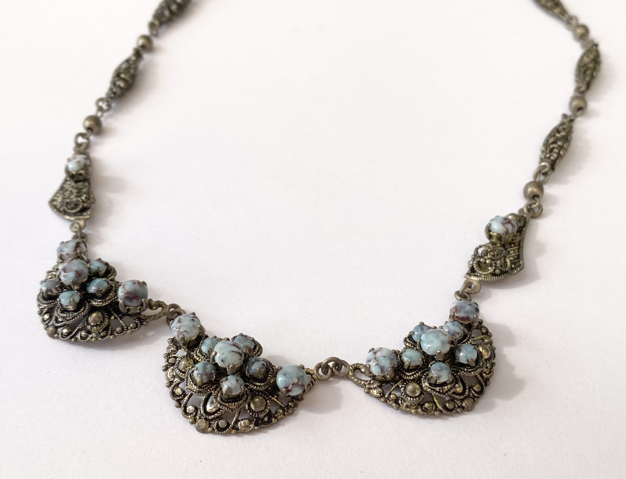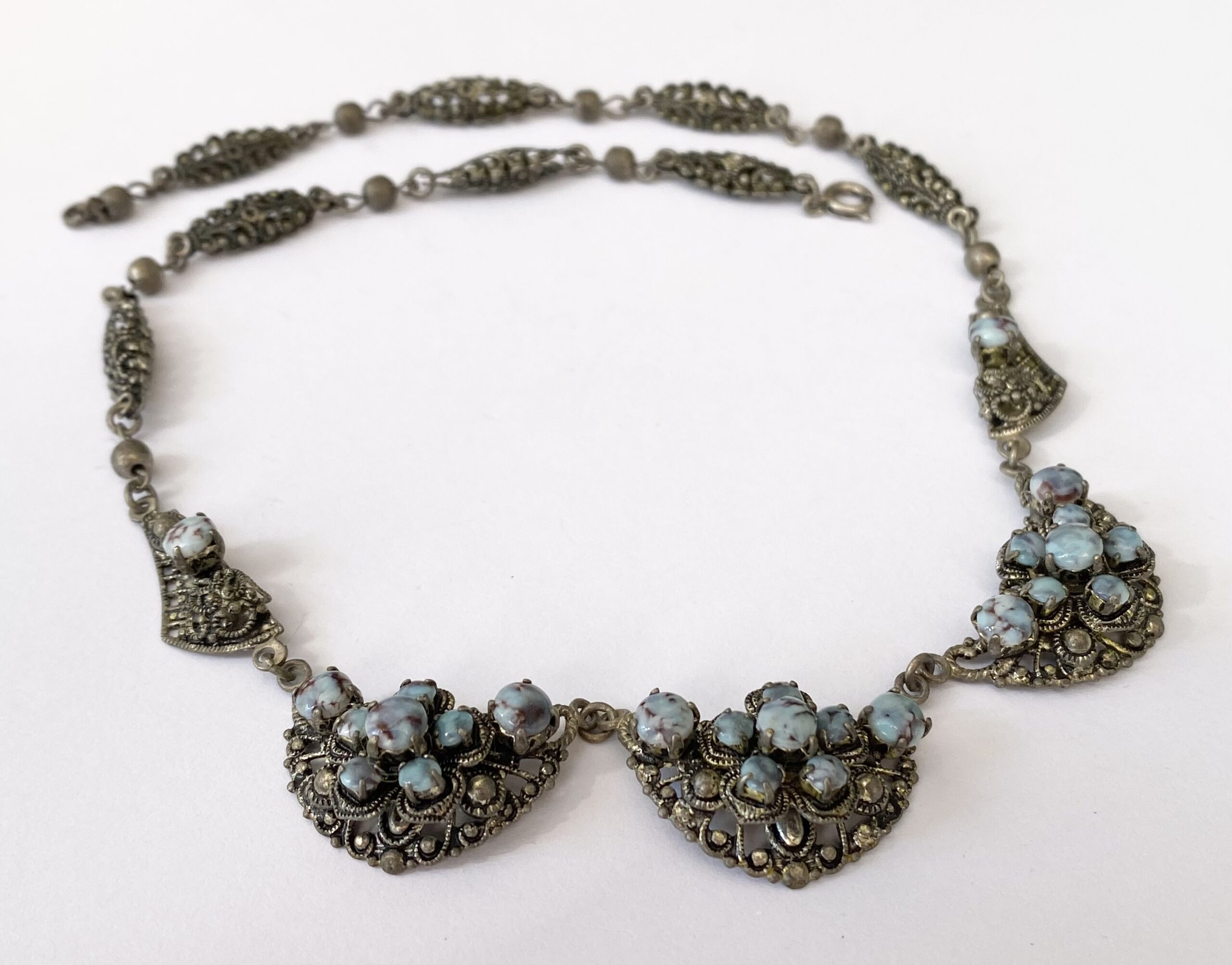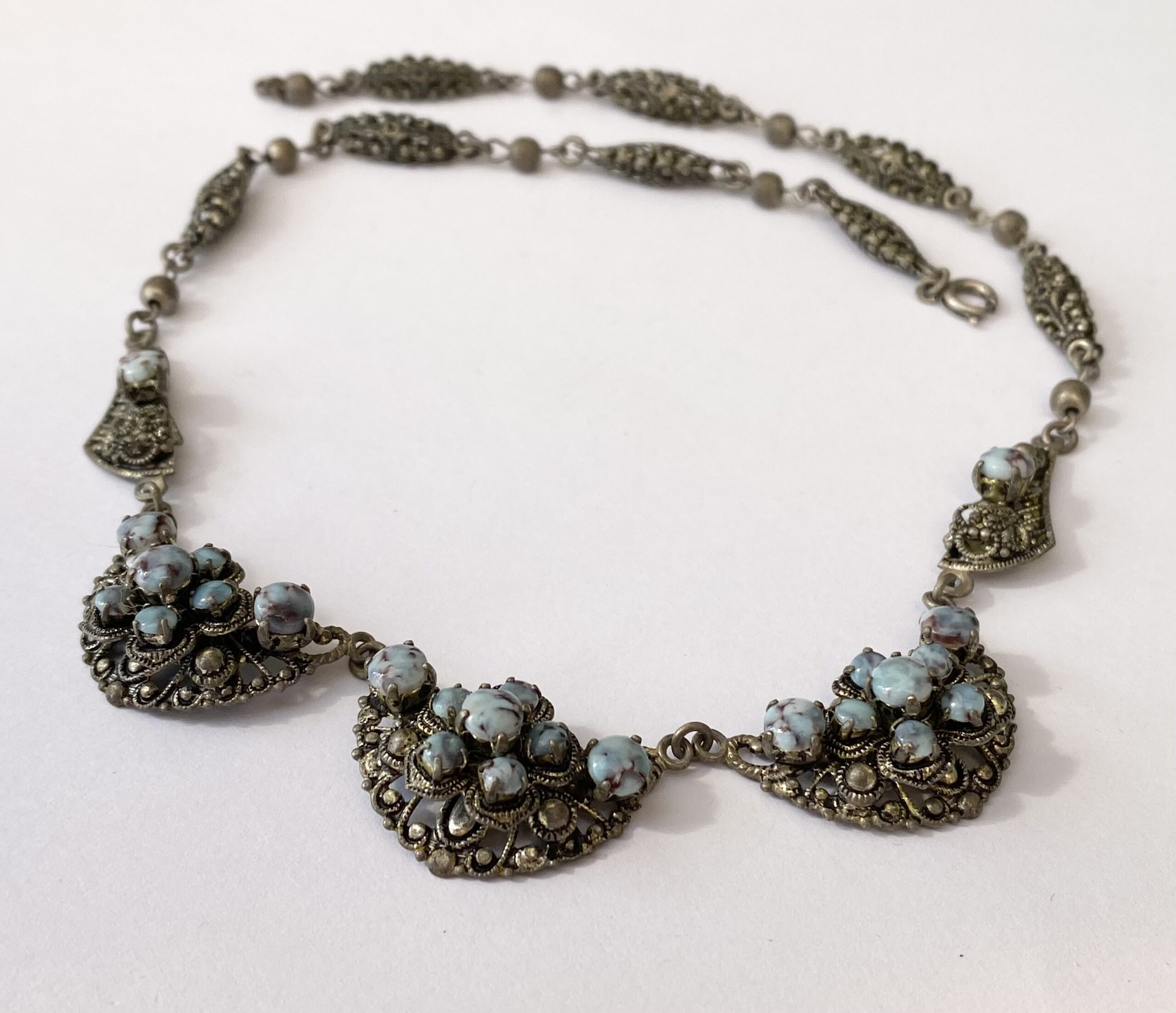 Necklace – Vintage Sterling Silver Rustic Chic Chain With Blue Stones. 3 x half moon central pendants