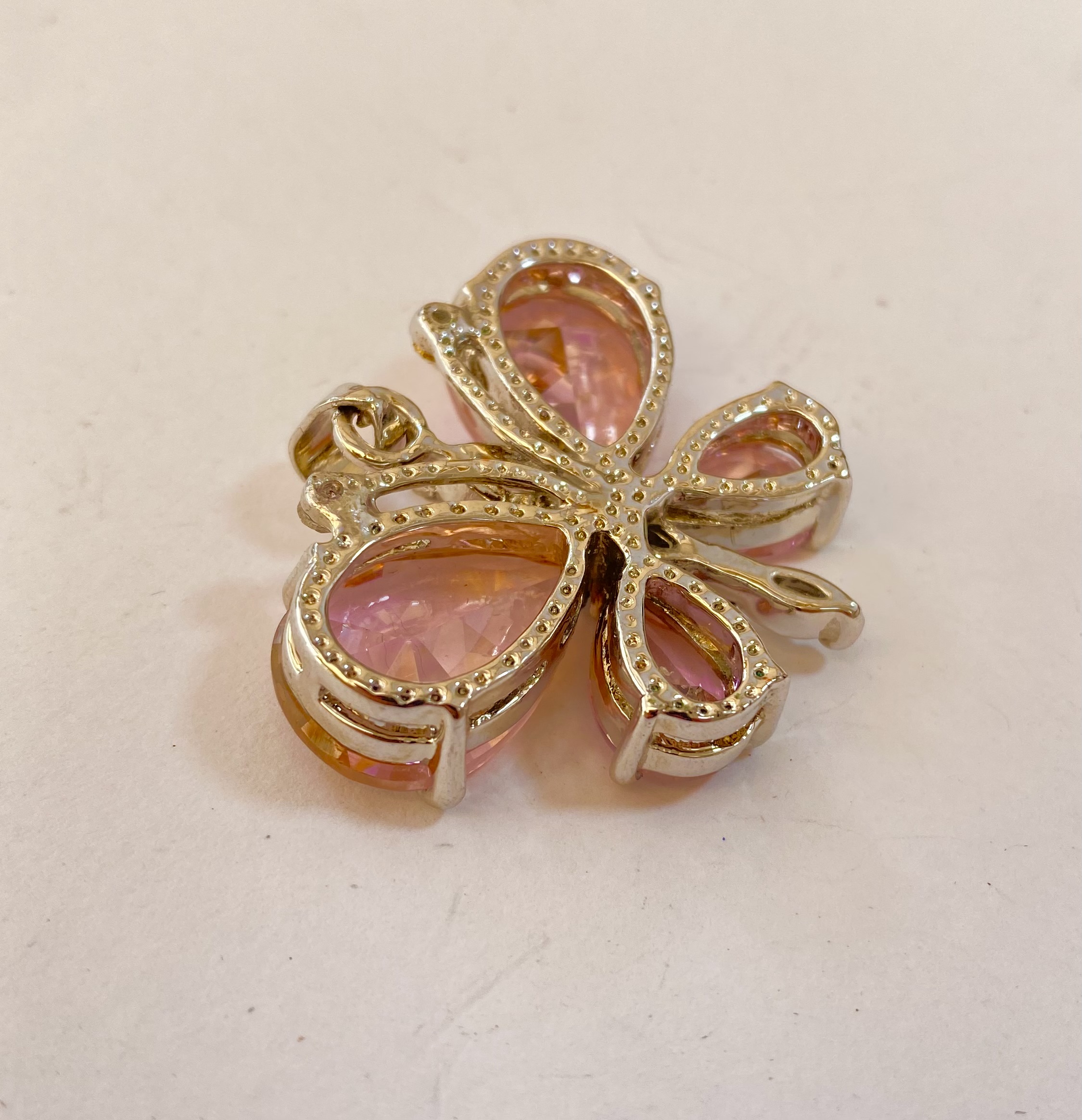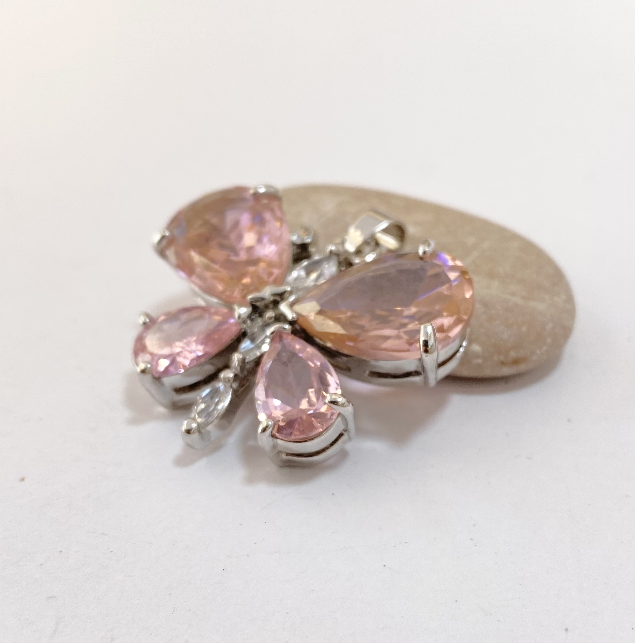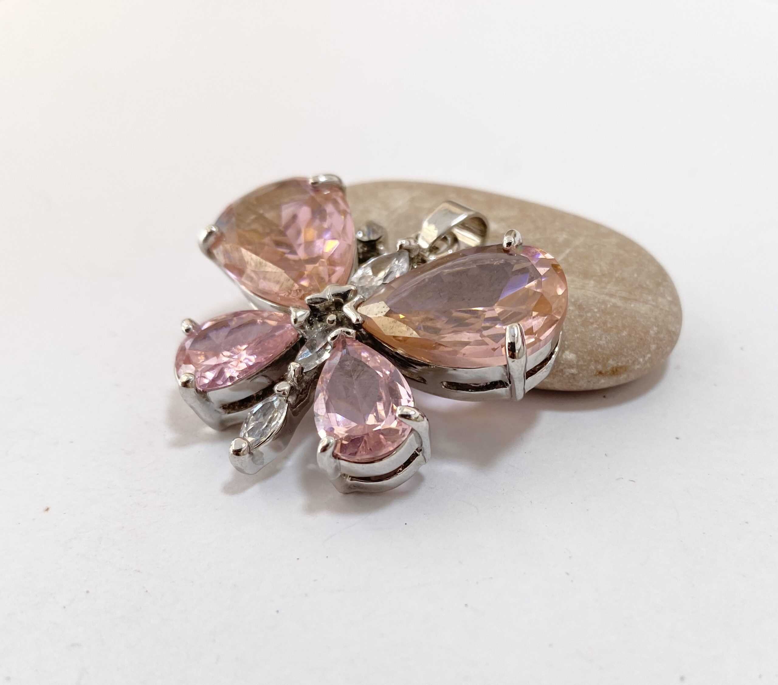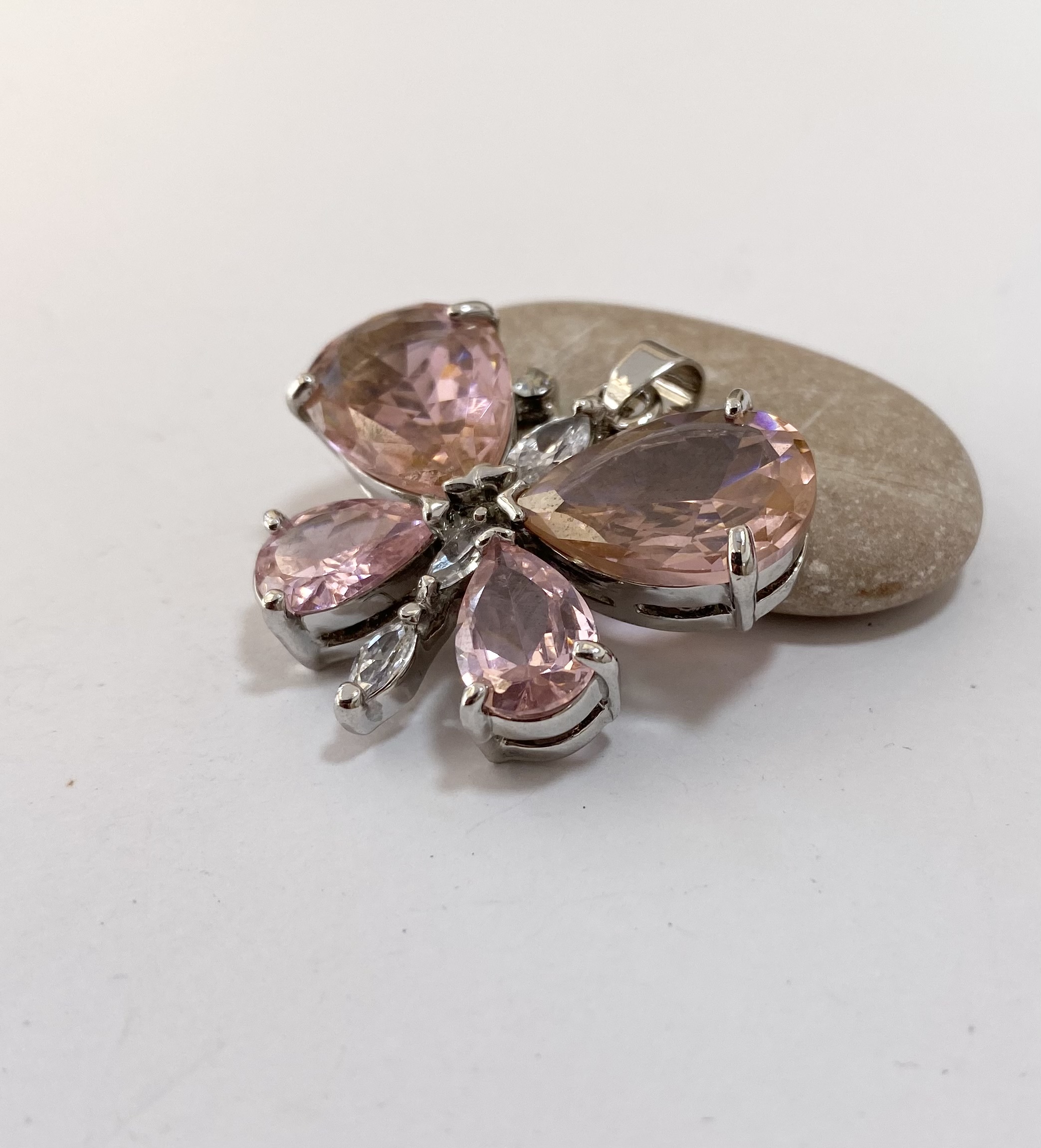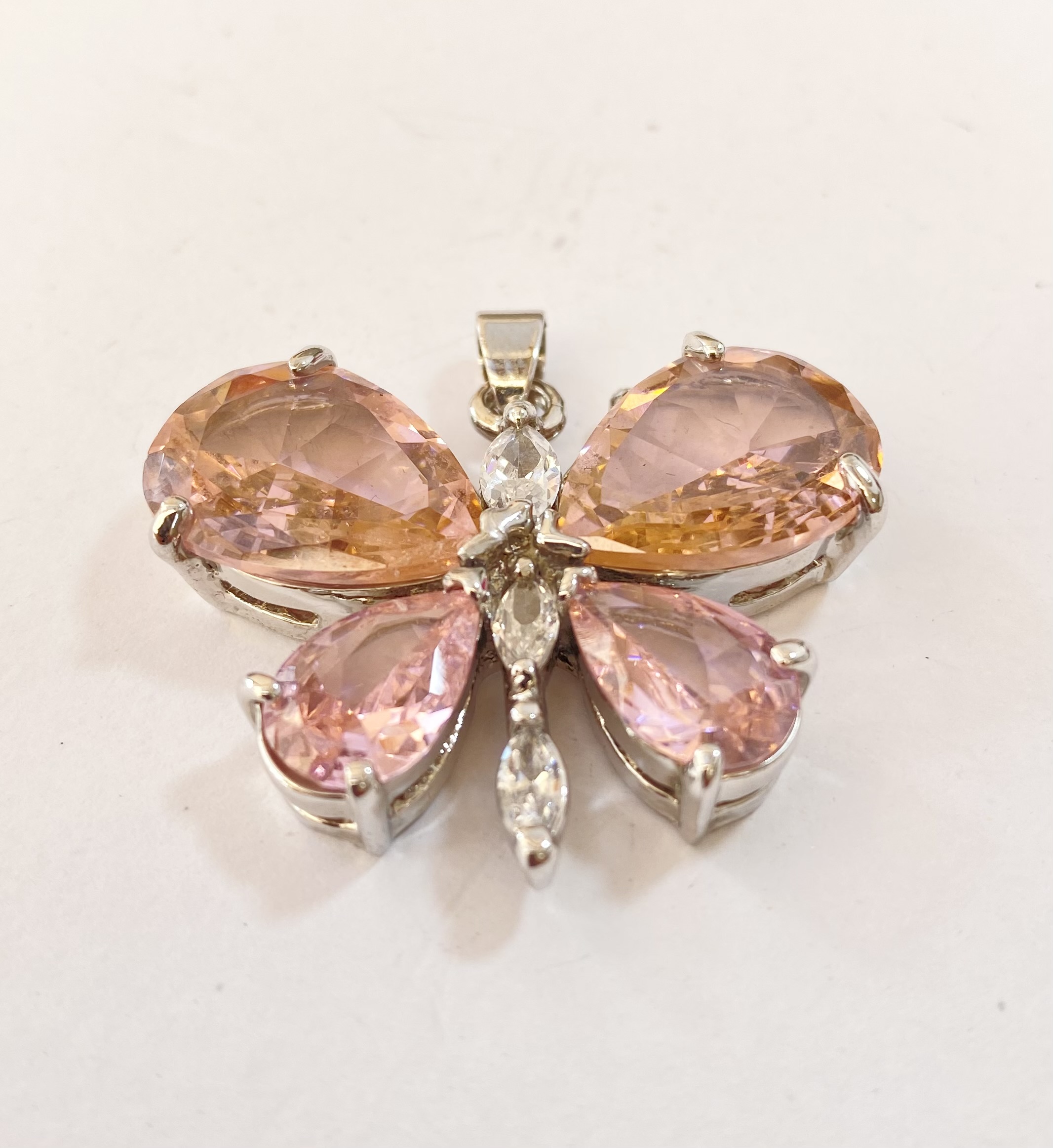 Pendant – Light Rose Gemstone Butterfly & Clear Stones. Silver Colour Dimensions: 35mm x 36mm Condition: Good